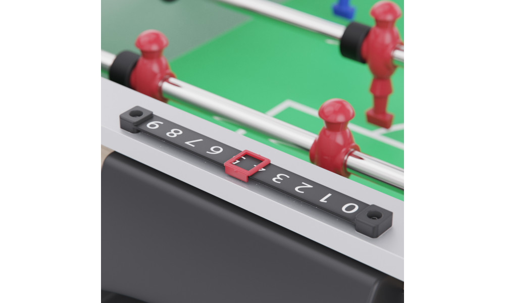 Игровая зона настольного футбола продумана до мелочей: бортики толщиной 12 мм, высотой 10,4 см обеспечивают комфортное ведение мяча, а толщина самого игрового поля — 3 мм — способствует плавному скольжению. В комплект входят 2 мяча диаметром 32 мм, что позволяет сразу начать игру. Фигурки игроков имеют высоту 96 мм и установлены на прочных металлических направляющих с удобными прорезиненными ручками.